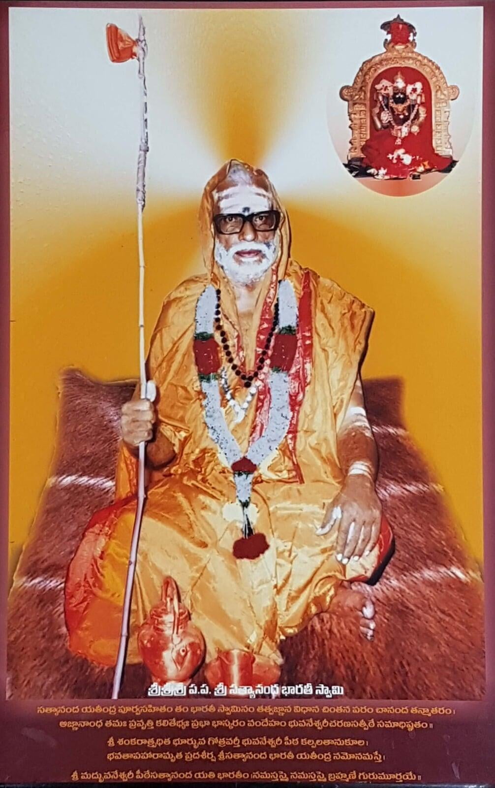 శ్రీ చిదానంద సరస్వతీ స్వాములవారి నిర్యాణము జరిగిన పిదప ధర్మకర్తలు సమావేశమై ఈ యాశ్రమమున ఆచార్య పీఠమును నెలకొల్ప నిశ్చయించిరి. ఒక యతీశ్వరుని పీఠాధిపతిగా జేసి గురు పరంపర కొనసాగింప సంకల్పించిరి. అందులకై ఆచార్యునిగూర్చి అన్వేషించిరి. ఆ సమయమున శ్రీ సత్యానంద భారతీ స్వామివారు విజయవాడలో తురీయాశ్రమము స్వీకరించినట్లు తెలియ వచ్చెను. ధర్మకర్తలు వారిని సమీపించి తమ యాశ్రమములో పీఠాధి పత్యము వహింప బ్రార్ధించిరి. వారంగీకరింప 14-11-1978న వారిని శ్రీ భువనేశ్వరీ పీఠమునకు అధిపతిగా పట్టాభిషేకము చేసిరి.